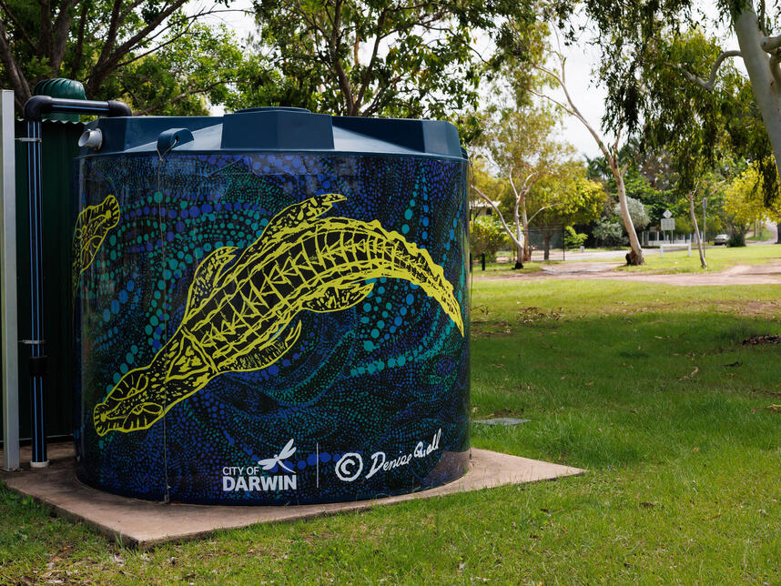 Denise Quall worked alongside digital designer Ciella Williams to create brilliant designs with her artworks. This process enabled the art to be digitised in large format for rapping around four irrigation tanks located at sporting ovals in the northern suburbs and throughout the Waters Ward.