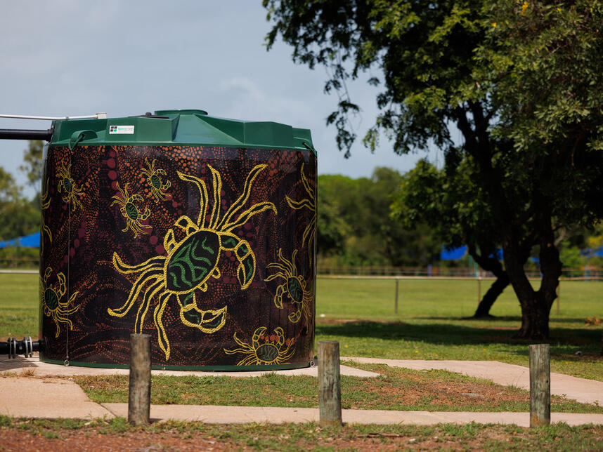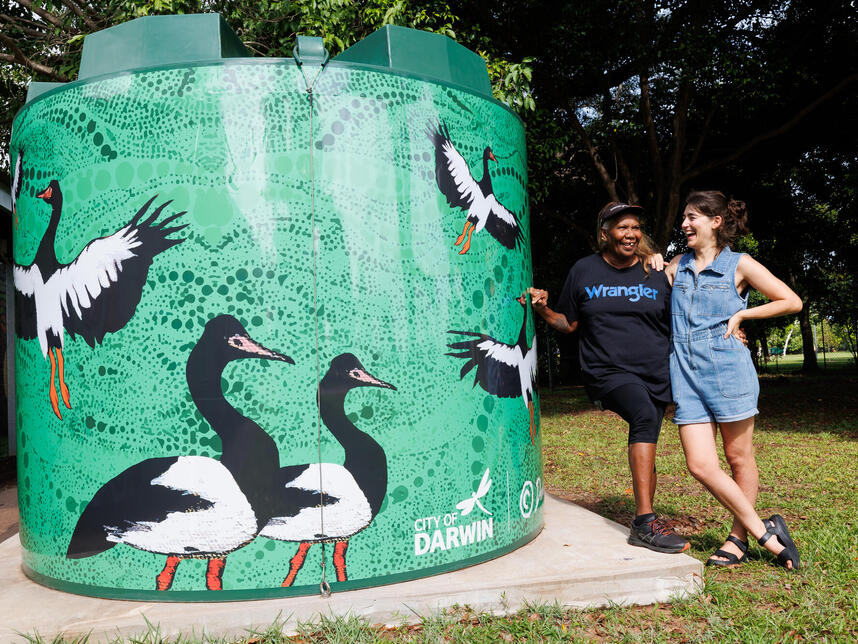 The Anula water tank features Gakinga (magpie goose). Gakinga welcomes balnba (the wet season). This is a time of rejuvenation.