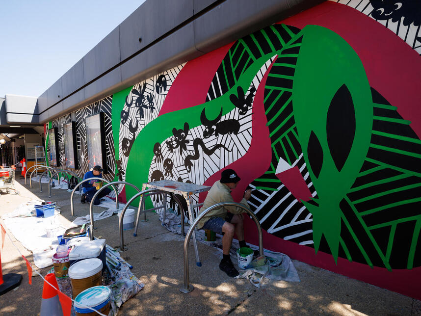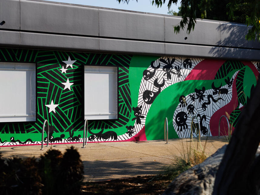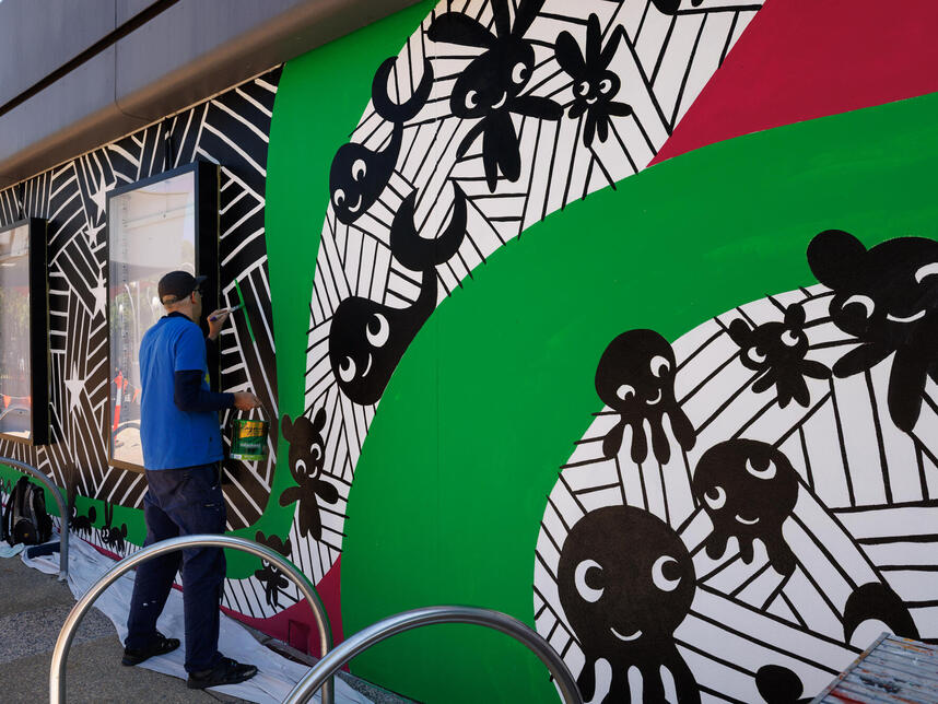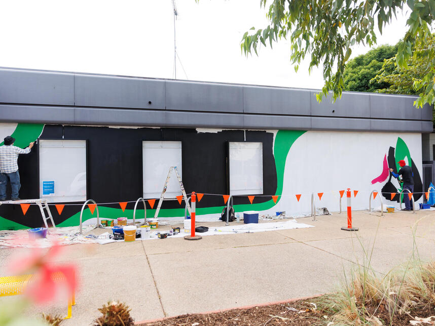 Artist Kris Keogh transforms the library exterior with a bright and eye-catching mural.