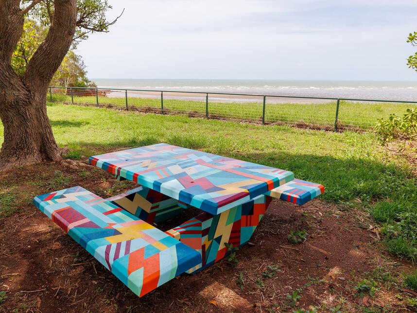 Commissioned by City of Darwin and proudly supported by the Northern Territory Government through a Tourism Town Asset Program grant, the Happy Place project is about reinventing weathered, urban outdoor public furniture and infrastructure into moments of delight to enliven our communal spaces.