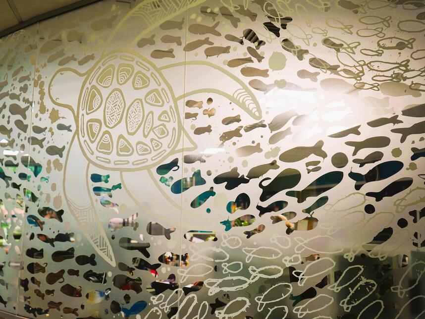Taleena Lui-Villaflor’s artwork provides screening and wayfinding in the customer service area.