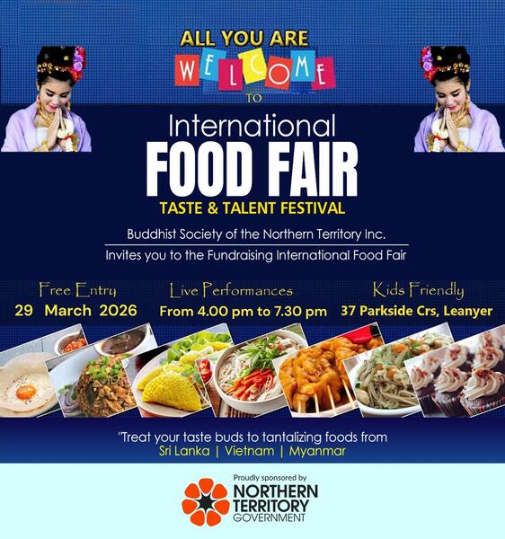 As a fundraiser for the maintenance of the Buddhist Society of Northern Territory, BSNT is organising an International Food Fair and Cultural Show on 29 th March 2026 (Sunday) from 4 pm onwards.