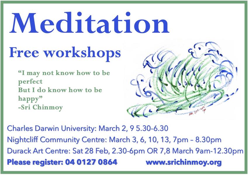 Free Meditation Classes The Sri Chinmoy Centre Nightcliff Community Centre Darwin NT 0810 Australia Date Tue, Mar 3 2026, 7pm - 8:30pm Add to calendar: Google Outlook iCal Free meditation classes introducing a range of simple techniques to help you establish your own practice at home. Attachment Size event-image-74417.jpg 26.87 KB Costs 0