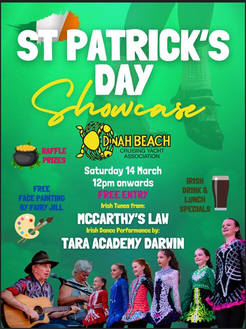 Wear green and get into the Irish spirit at the St Patrick’s Day Showcase at Dinah Beach Cruising Yacht Association.