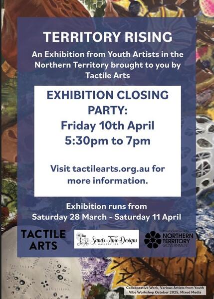 Tactile Arts presents Territory Rising: An Exhibition from Youth Artists in the NT as part of NT Youth Week 2026. This exhibition celebrates the next generation of Territory voices and highlights the creativity, culture, and emerging leadership of artists aged twelve (12) – twenty-five (25), offering opportunities to engage with the arts in meaningful and empowering ways.