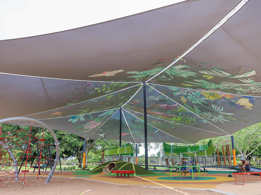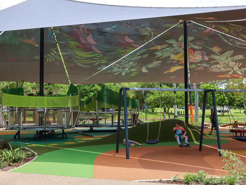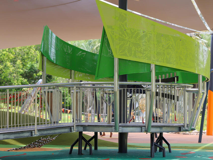 The play-space, located at Jingili Water Gardens, is an all-abilities accessible space that includes integrated artworks created in partnership with Arts Access Darwin and the Free Space Studio collective, a program that supports and advocates for local artists with disability.