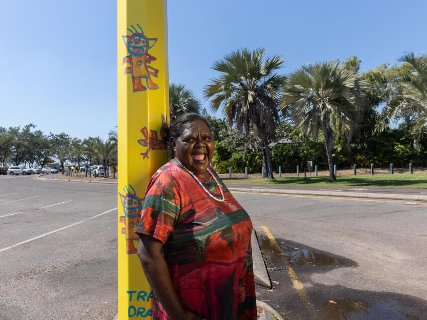 Local artist Tara Darcy’s artwork Maningrida Community features on four light pole wraps in the Nightcliff Jetty carpark.