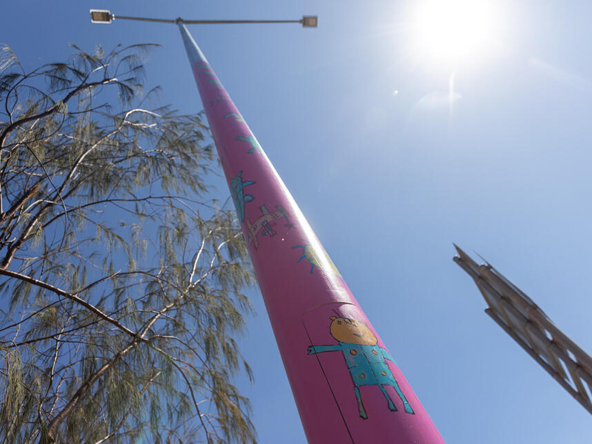 The light pole wraps include vibrant motifs from Tara’s artwork Maningrida Community, inspired by her coastal upbringing in West Arnhem Land. The artwork features colourful turtles, birds, planes, houses and people.