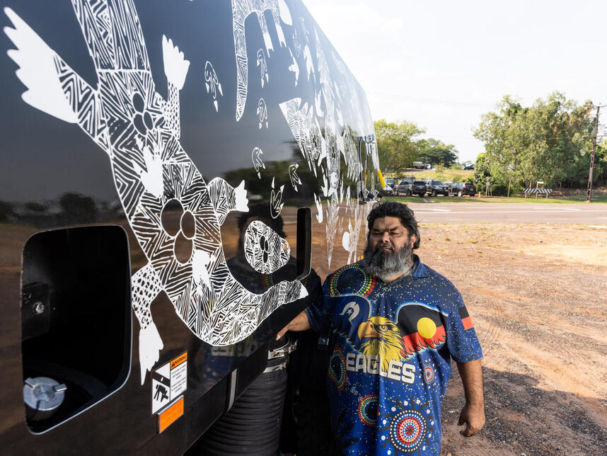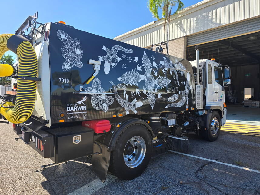 Fabian’s bold illustration brings together elements from his cultures: bush turkey tracks, dangalaba (crocodiles), eggs, and ceremonial spears – each symbol rich in meaning and deeply connected to Country. The artist creates all his works using pens and markers on paper. City of Darwin’s Arts Team worked with his original artwork to enlarge into a design for our new sweeper and become a moving canvas!